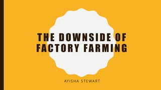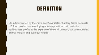 Factory farming produces large amounts of greenhouse gases and pollutes the environment. It relies heavily on antibiotic use which contributes to growing antibiotic resistance issues. Animals raised in factory farms live in cruel conditions, confined in small spaces and unable to perform natural behaviors. While factory farming is economically important, alternatives such as clean meat production could help transition to more sustainable and humane food systems.