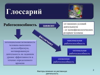 Документ обсуждает факторы, влияющие на умственную деятельность студентов, включая работоспособность, утомление, переутомление и усталость. Также рассматриваются методы восстановления сил и влияния внешних и внутренних факторов на продуктивность умственного труда. Важные аспекты включают необходимость рационального режима труда, физическую активность и влияние социальных условий на обучение.