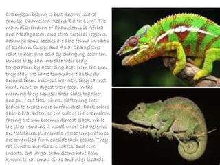 Chameleons are a famous lizard family known for their ability to change color. They are found primarily in Africa, Madagascar, and other tropical regions. Chameleons change color to regulate their body temperature, with darker colors absorbing more heat from the sun. They are ectothermic animals whose temperature depends on external heat sources. Chameleons have a long, sticky tongue that helps them catch prey and strong jaws to crush and consume their food.