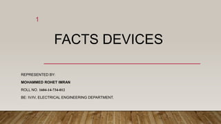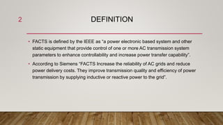 FACTS devices are power electronic systems that provide control of AC transmission system parameters to improve power transfer capability and grid stability. FACTS stands for Flexible Alternating Current Transmission System and includes static equipment like STATCOMs. FACTS devices are classified as series controllers that inject voltage and shunt controllers that inject current. They are used to control impedance, voltage, current and phase angle to enhance controllability, reliability and power quality on transmission lines. While expensive, FACTS provide benefits like increased transmission capacity, damping of oscillations and improved stability.