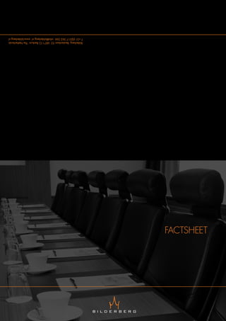 This document provides information on various Bilderberg hotels and meeting venues located throughout the Netherlands. It lists each property name, contact details, location details, number of hotel rooms, meeting rooms and event space capacities. The properties range from historic hotels and castles to more modern conference center style hotels, located in cities and more rural settings.