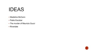 The document discusses various true crime topics and documentaries that could provide guidance for developing a documentary project. It outlines elements from the Netflix documentary "Abducted in Plain Sight" that effectively set the 1970s tone using reenactments, interviews, and film filters. Color schemes, fonts, and other aesthetic choices that locate the story in that era are discussed. Interview styles and uses of archival materials from "The Lady Gucci" and "Night Stalker" documentaries are also examined as potential references. The document concludes by listing several documentaries and next steps for the project.