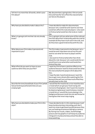 The document discusses a documentary film being made about Leeds fans and how they affect the club and players. The filmmaker wants to explore the relationship between fans and the club, what fans like to do on match days, and what fans and players think about each other. The filmmaker is a lifelong Leeds fan who wants the film to have a positive effect on audiences by showing how much fans impact the club. The style will include music, visuals, videos and graphics to keep viewers engaged while conveying the nice mood and memories of being a Leeds fan.