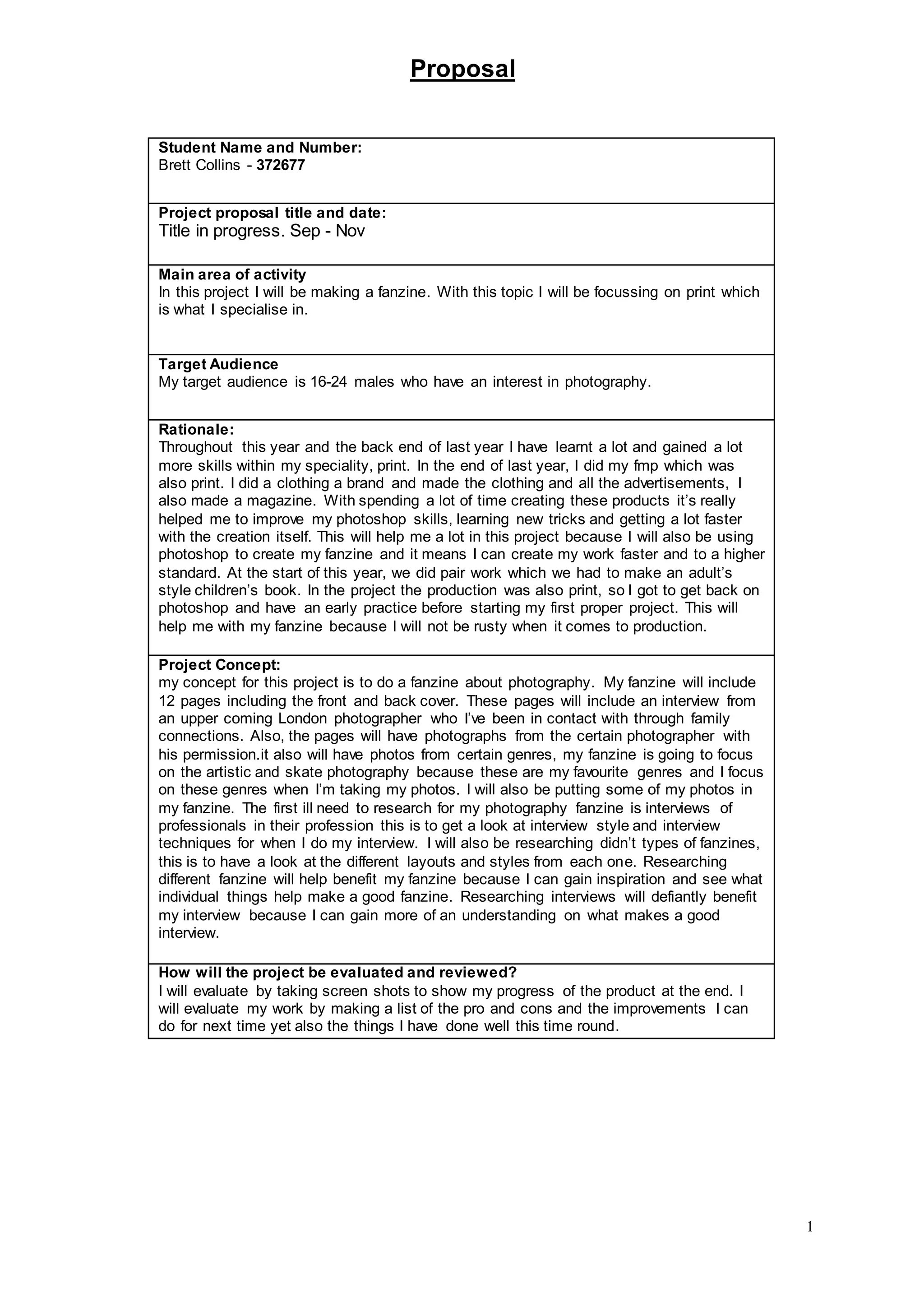 Brett Collins proposes creating a 12-page fanzine about photography, targeting 16-24 year old male photography enthusiasts. The fanzine will include an interview with an up-and-coming London photographer, photographs from genres like artistic and skate photography, and some of Brett's own photos. Brett outlines tasks for each week such as creating the front cover, editing the interview, laying out pages, and designing the back cover.