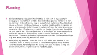 This document summarizes the process of planning, preparing, and producing a fanzine about the Kardashian family. The author began by creating a mind map and mood board to plan content and design. Research was conducted on the TV show and family members. A survey was created to understand reader opinions. Pages were drafted and designed in Photoshop, using skills like adjusting image layers and opacity. The content focused on the family's backstory and rise to fame surrounding the OJ Simpson trial. Areas for improvement included better time management and organization when files were saved across devices.