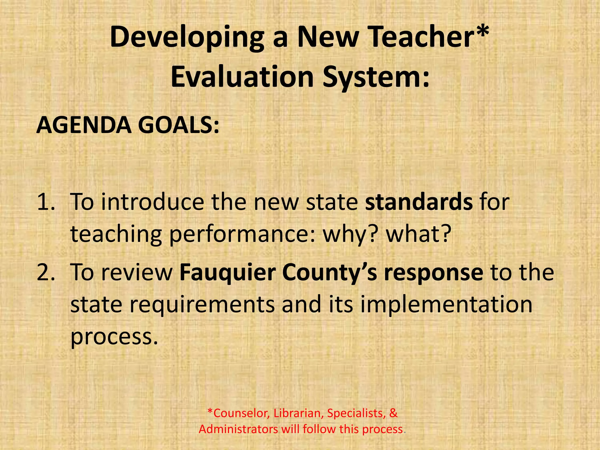 This document introduces Fauquier County Public Schools' new teacher evaluation system which will be field tested from September 2011 to May 2012. The new system is in response to state legislative mandates and will evaluate teachers based on 7 standards rather than the previous 5. It aims to give teachers more voice in the process and make evaluations more meaningful. Six schools will participate by having teachers collect evidence of their performance and provide feedback. The goal is to create a practical and respectful system that encourages reflection and favors student learning outcomes over one-time test scores. Teachers and administrators will try out the standards in practice and suggest improvements.