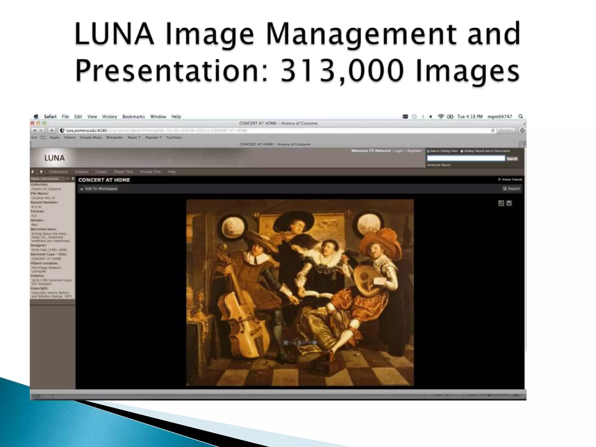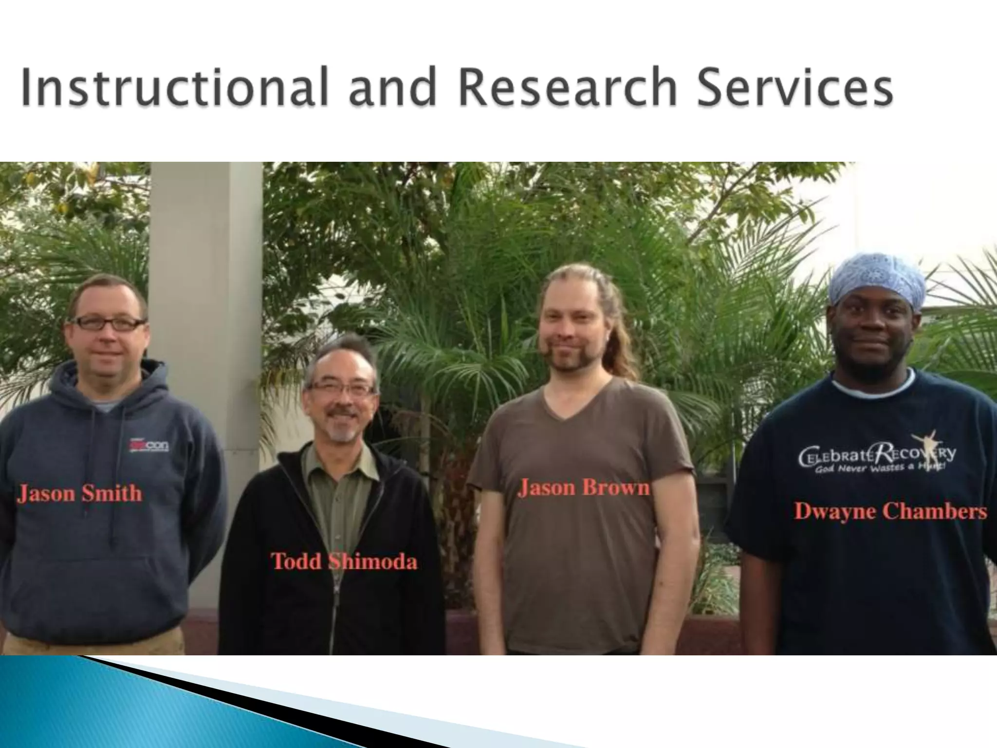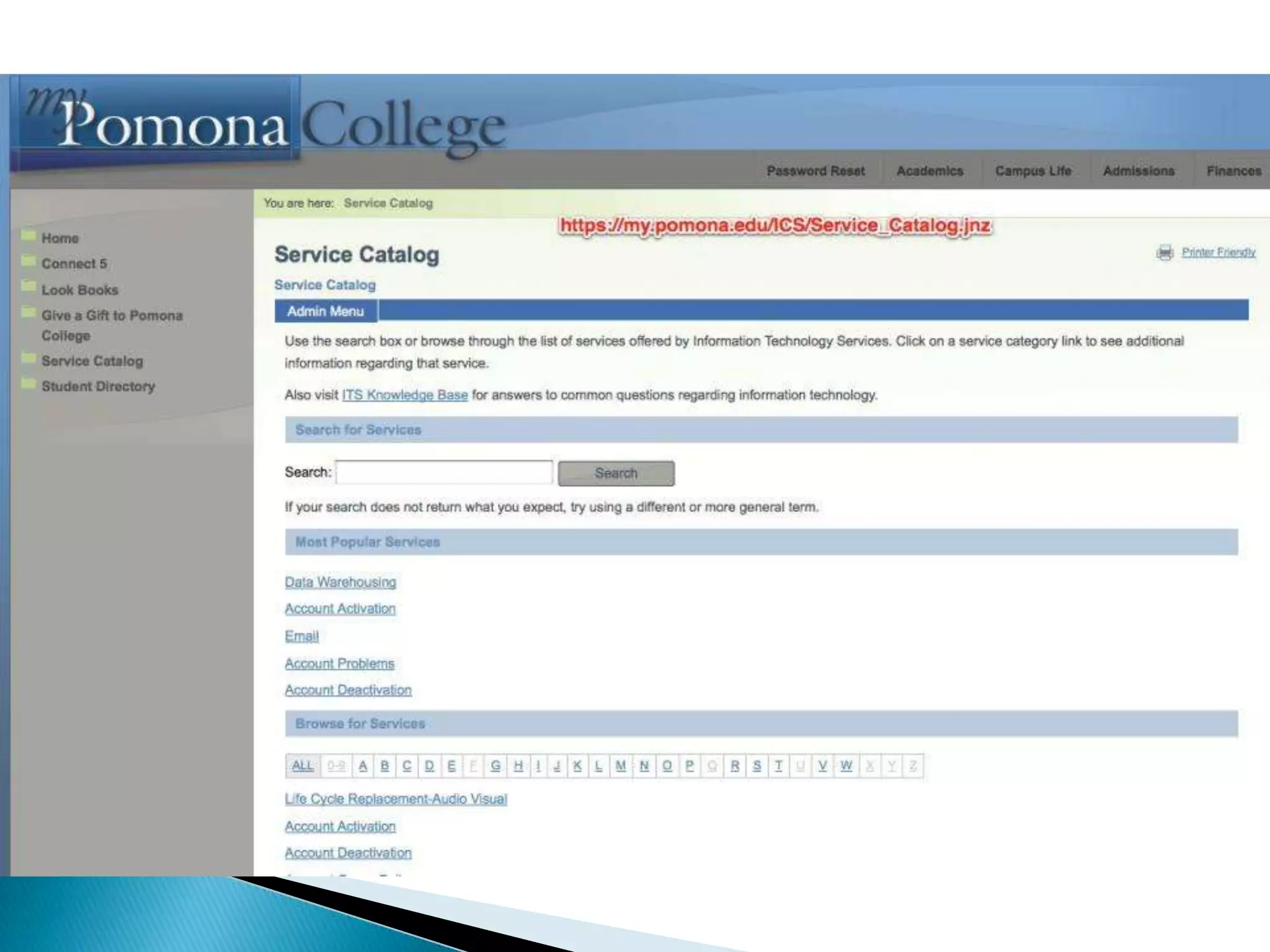 The document outlines the departments and services of the Information Technology Services department at Pomona College, including network infrastructure support, classroom technology support, security services, project management, and support for administrative systems like the campus portal and learning management system. It provides an overview of the staffing and some key metrics for service usage. The document also discusses some strategic initiatives and technology challenges facing the department.