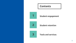 The document discusses strategies to boost student engagement and retention in educational settings, emphasizing the importance of active, collaborative learning and effective faculty-student interaction. It highlights tools and resources, such as self-assessments and feedback mechanisms, that can enhance student participation and accountability. Additionally, it outlines methods for early intervention and addressing student challenges to increase course retention rates.
