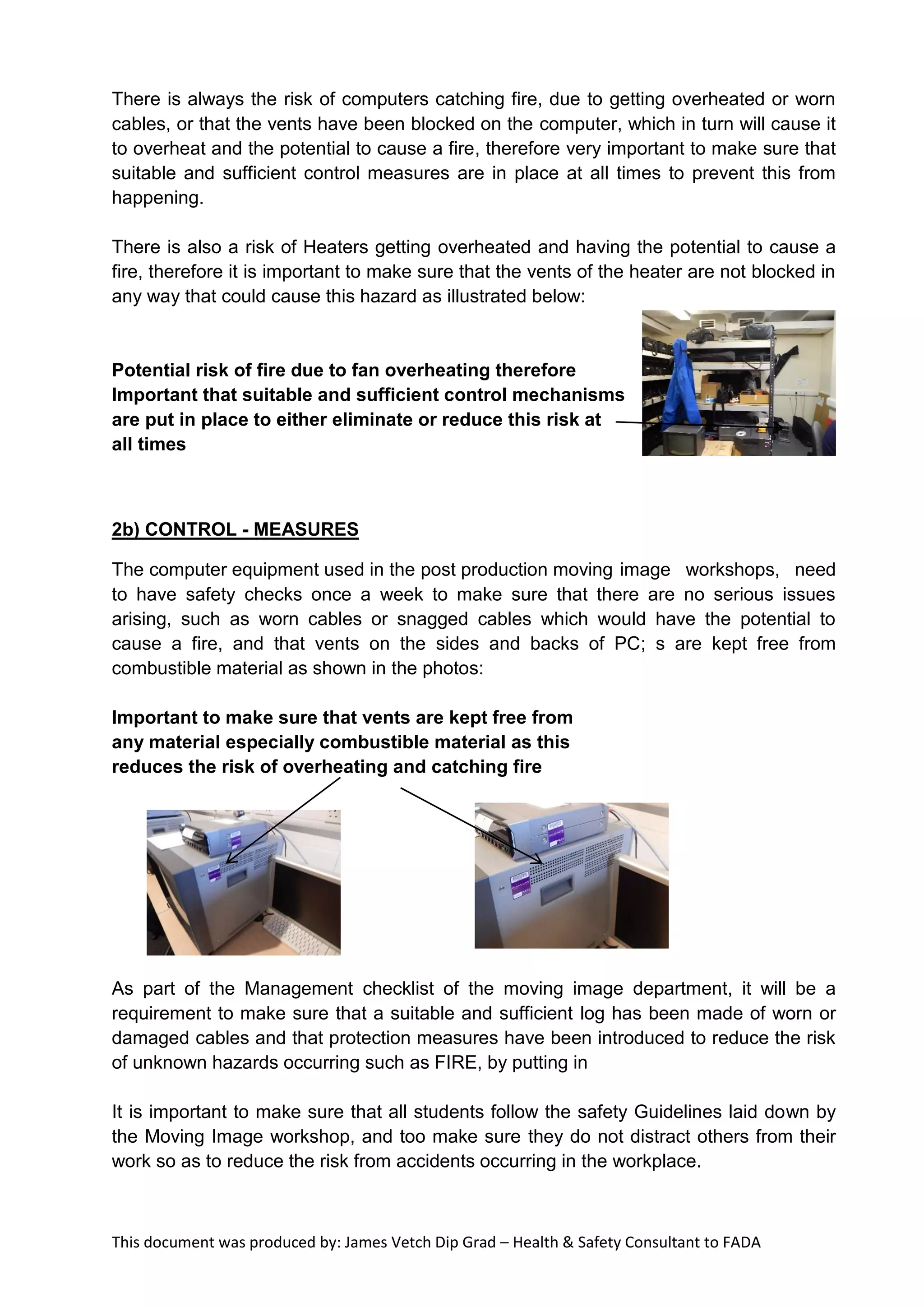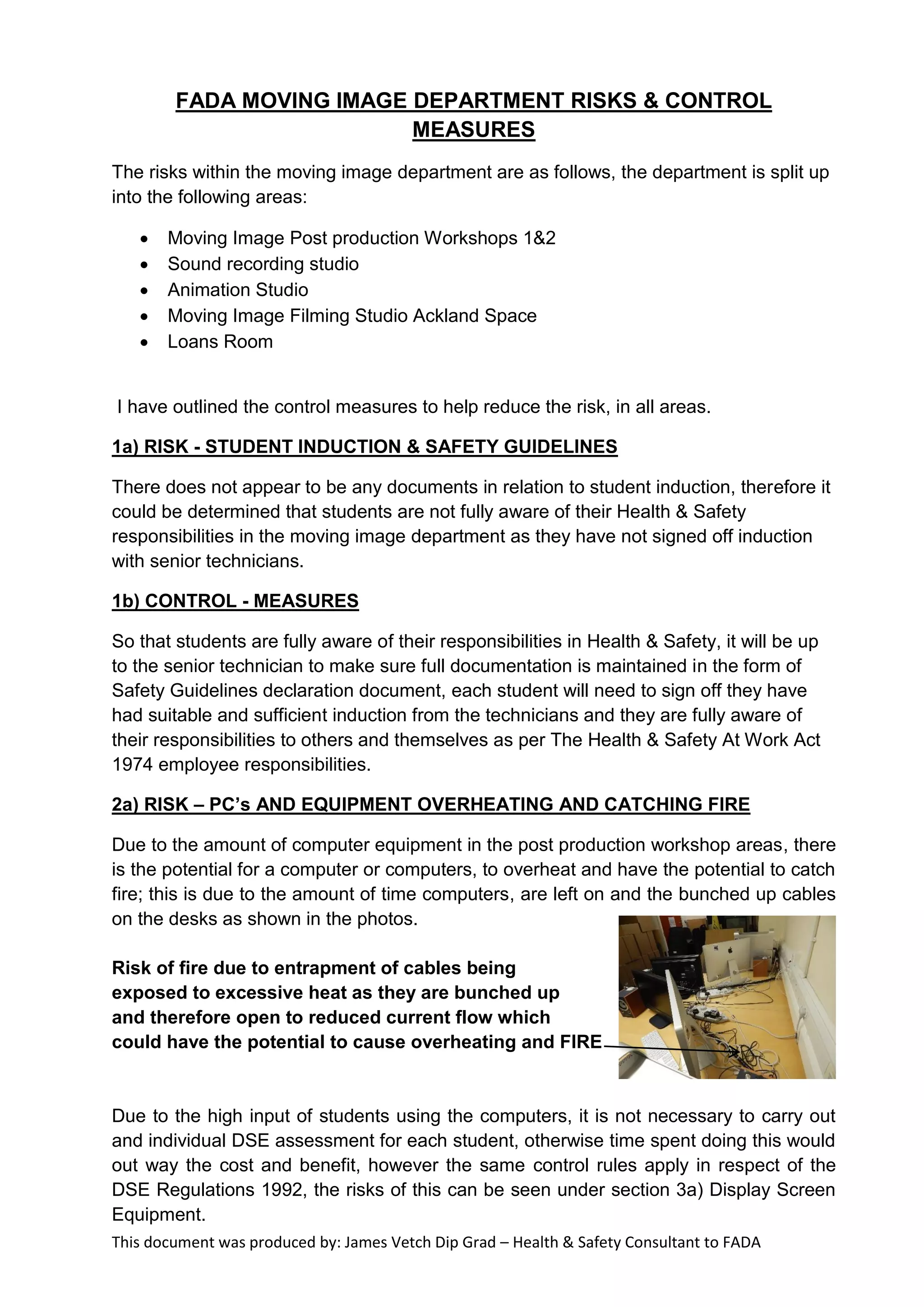 This document outlines health and safety risks and control measures for the moving image department. Key risks include a lack of student safety inductions, overheating computers causing potential fires, and trip hazards from cables in studios. Control measures include implementing signed safety guidelines and induction documents for students, performing weekly safety checks of computers, and implementing cable management systems. Slip, trip, and fall risks are prevalent, especially in the Ackland filming studio, due to cables, clutter, and an unsafe gantry. Control measures such as enforcing safe footwear, cleaning spills quickly, and reducing clutter are recommended.