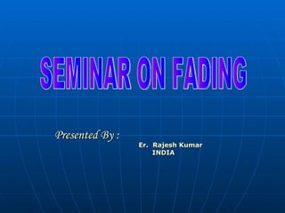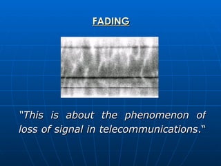 The document discusses the phenomenon of fading in telecommunications, emphasizing its impact on signal loss through small scale multipath propagation, which leads to variations in signal amplitude, phase, and delays. It categorizes fading into types such as flat fading and frequency selective fading, along with their causes and the effects of Doppler shifts. Additionally, statistical models for understanding multipath fading channels, like Clarke’s model and the Saleh and Valenzuela indoor statistical model, are presented to illustrate the complexity of this phenomenon in wireless communications.