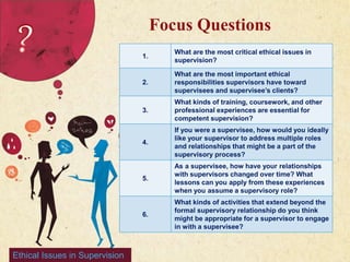 This document summarizes an presentation on ethical issues in clinical supervision. It discusses critical issues like competence, multiple roles, and boundaries. Maintaining appropriate boundaries is important to avoid dual relationships that could harm supervisees or impair objectivity. Supervisors must provide feedback and empower supervisees. They are responsible for addressing issues like impairment or lack of competence through remediation or other corrective actions. Managing multiple roles requires open discussion to clarify responsibilities and avoid abuses of power.