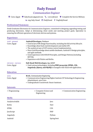 Fady Fouad is a communication engineer from Cairo, Egypt, with a strong background in electronics and communication. He has experience as an Android developer and full-stack web developer, utilizing a variety of programming languages and technologies. He holds a B.S.E in communication engineering and possesses skills in programming, design patterns, and agile methods.