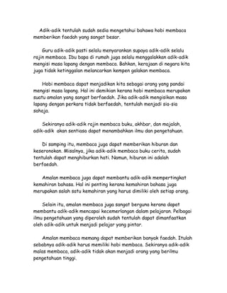 Hobi membaca memberikan banyak faedah seperti menambah ilmu, menghiburkan, dan meningkatkan kemahiran bahasa. Dengan membaca, adik-adik dapat mengisi masa lapang dengan kegiatan berfaedah dan mencapai kecemerlangan dalam pelajaran. Oleh karena itu, penting bagi adik-adik untuk menjadikan membaca sebagai hobi.