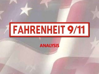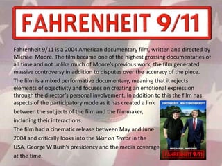 This document provides an analysis of a scene from Michael Moore's documentary film Fahrenheit 9/11. The scene shows Moore filming a lone border patrol officer patrolling the entire Oregon coastline due to budget cuts. Moore uses various cinematic techniques like landscape shots, point-of-view shots from the police car, and interviews to emphasize the lack of security and undermine the threat of external attacks. He contrasts these images with footage of Bush preparing for a speech and the US military preparing for war to argue that the real plan was to go to war in Iraq rather than protect the homeland.