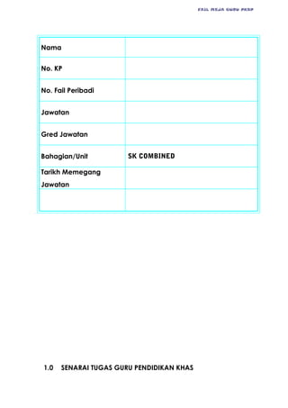 Dokumen ini adalah fail meja untuk guru pendidikan khas yang menyenaraikan tanggungjawab dan tugas mereka termasuk pengurusan kurikulum, kokurikulum, murid, prasarana, kewangan, dan hubungan komuniti. Ia juga menekankan pentingnya pelaksanaan perkhidmatan pendidikan yang profesional dan berkualiti bagi memenuhi kepuasan pelanggan. Proses kerja ditetapkan secara rinci untuk setiap fungsi dalam pengurusan pendidikan khas.