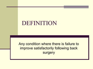 This document discusses failed back syndrome, specifically defining it as any condition where there is failure to improve satisfactorily following back surgery. It then classifies failures into those with no immediate improvement and temporary relief but recurrence of pain within weeks, months, or years. Causes of failures include wrong diagnosis, technical errors during surgery, infection, arachnoiditis, and recurrent stenosis. The document also discusses juxtafacet cysts near facet joints.