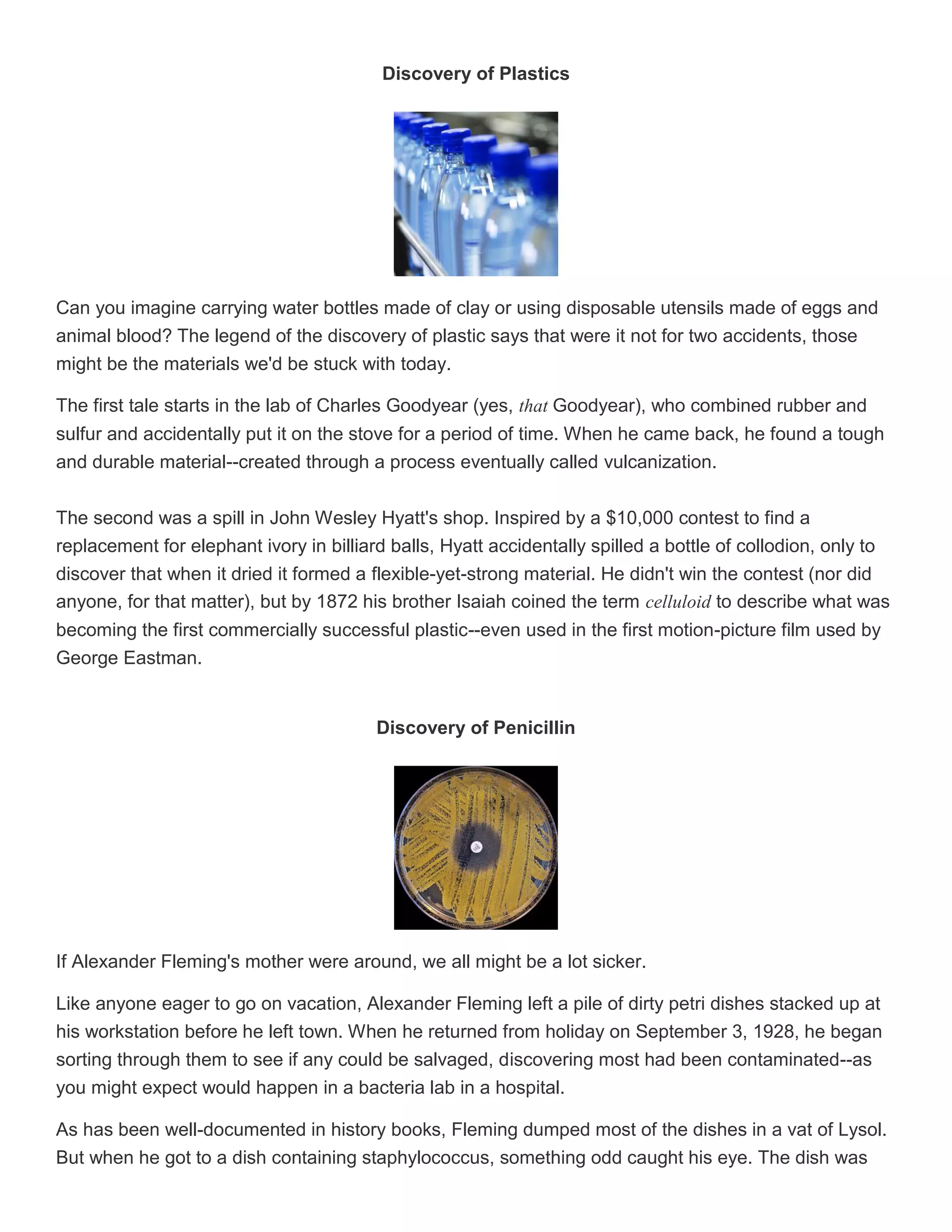 This document summarizes the discovery of two important materials: plastics and penicillin. It describes how plastics were discovered by accident through Charles Goodyear's experiments with rubber and sulfur and John Wesley Hyatt's spilled bottle of collodion. It also recounts how Alexander Fleming discovered penicillin by accident when he noticed a mold growing in one of his dirty petri dishes that seemed to kill the surrounding bacteria, an observation which led to the identification of penicillin as an antibiotic. Both plastics and penicillin have gone on to have huge impacts despite originating from accidental discoveries.