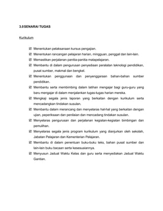 Dokumen ini menggambarkan maklumat mengenai pegawai En. Ahmad Fitri Bin Mohamad Zuki yang memegang jawatan PK 1 (dalaman) dengan tanggungjawab dalam pengurusan dan pelaksanaan kurikulum serta pentadbiran di Sekolah Kebangsaan Kampung Kuala Sibuti. Tugas beliau termasuk merancang, menyelaras, dan melaksanakan program pendidikan dan pengurusan sekolah, serta membantu dalam penilaian dan latihan guru-guru baru. Objektif utama adalah untuk memastikan kualiti pengurusan sekolah dan melahirkan sumber manusia berkualiti.