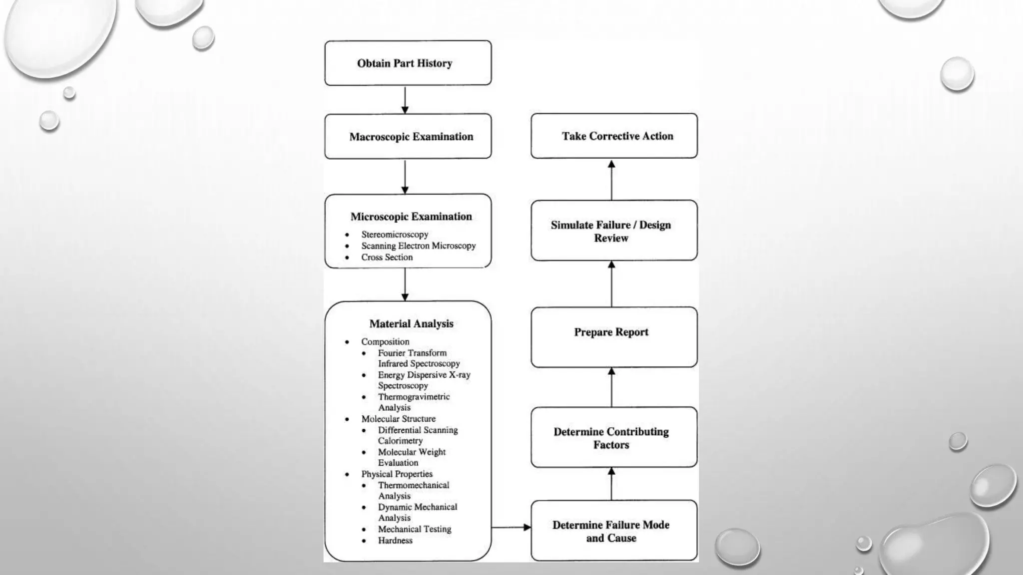 This document provides information on failure analysis procedures for polymer materials. It discusses visual examination, identification analysis through techniques like FTIR and DSC, and microstructural analysis. Specifically, it describes different failure modes like excessive deformation, ductile failure, and brittle failure. It also outlines how FTIR can be used to analyze multilayer films and provides examples of glass transition temperatures and decomposition temperatures for various polymers.