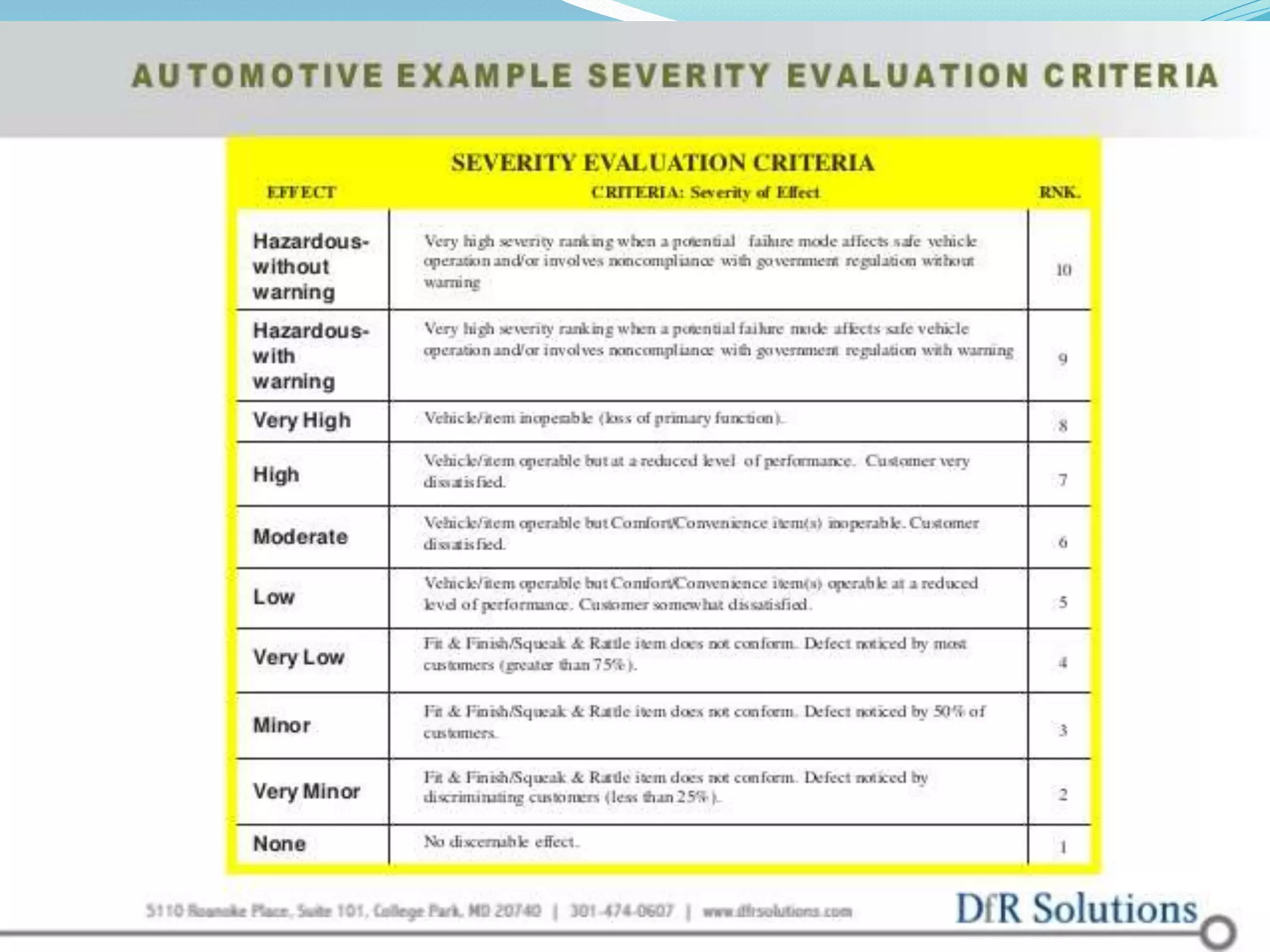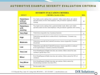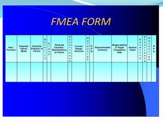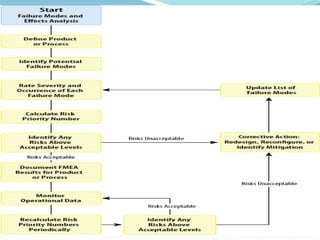 Failure mode and effects analysis (FMEA) is a method to identify potential failures, determine their causes and effects, prioritize risks, and identify actions to address high-priority risks. An FMEA involves assembling a cross-functional team to analyze a process, product or service by identifying functions, potential failure modes and effects, causes, controls, severity, occurrence, detection ratings and risk priority numbers to prioritize improvement actions. FMEAs are used throughout a product or service lifecycle to prevent and reduce failures and risks.