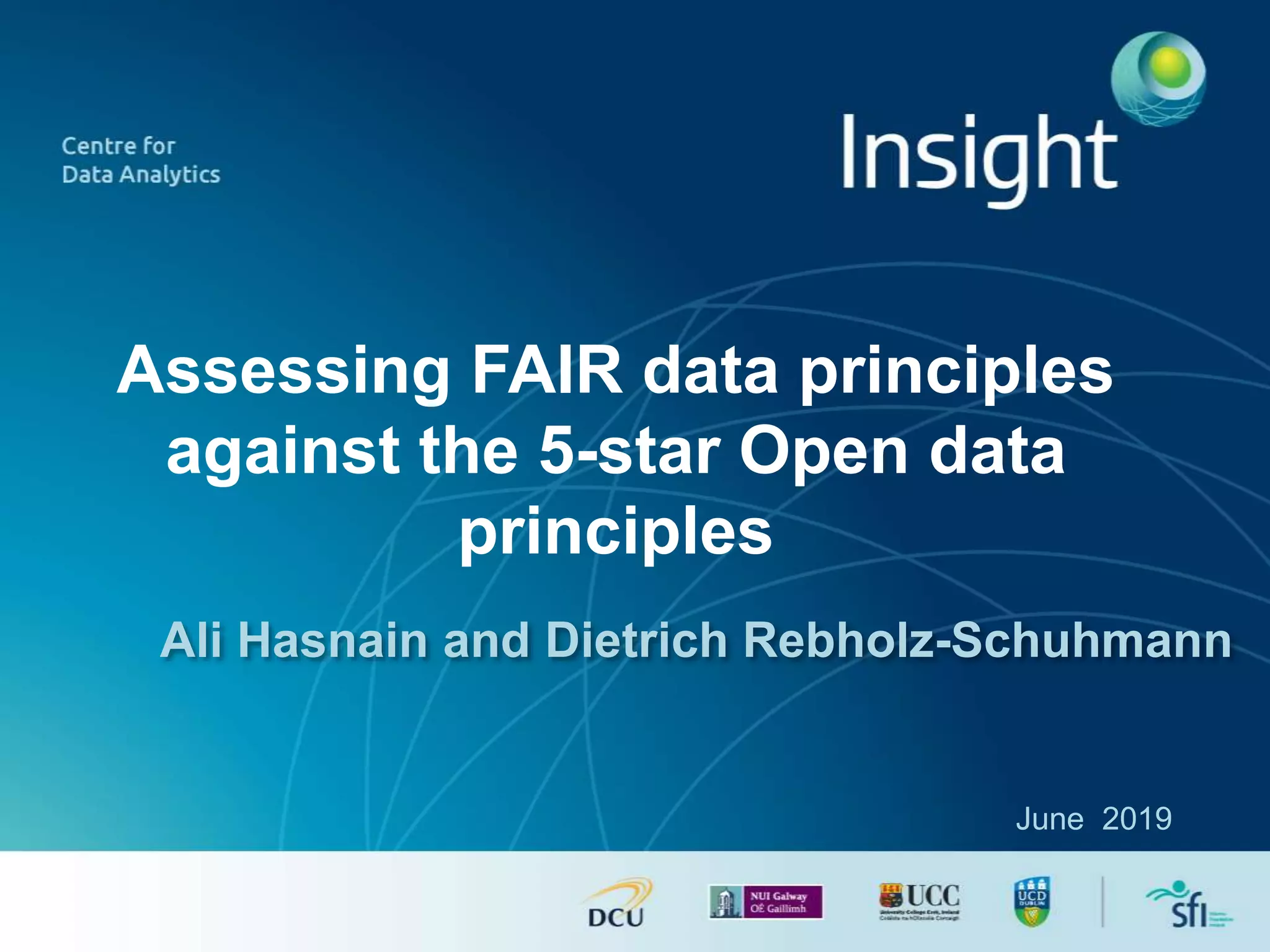 The document discusses the comparison between FAIR data principles and the 5-star open data principles, focusing on aspects like interoperability and findability. It highlights the distinctions and overlaps between the two frameworks, emphasizing that FAIR principles prioritize user needs and data reusability, while 5-star principles offer a more idealistic approach to open data. The document concludes by questioning the future effectiveness of both principles regarding data reusability and accessibility.