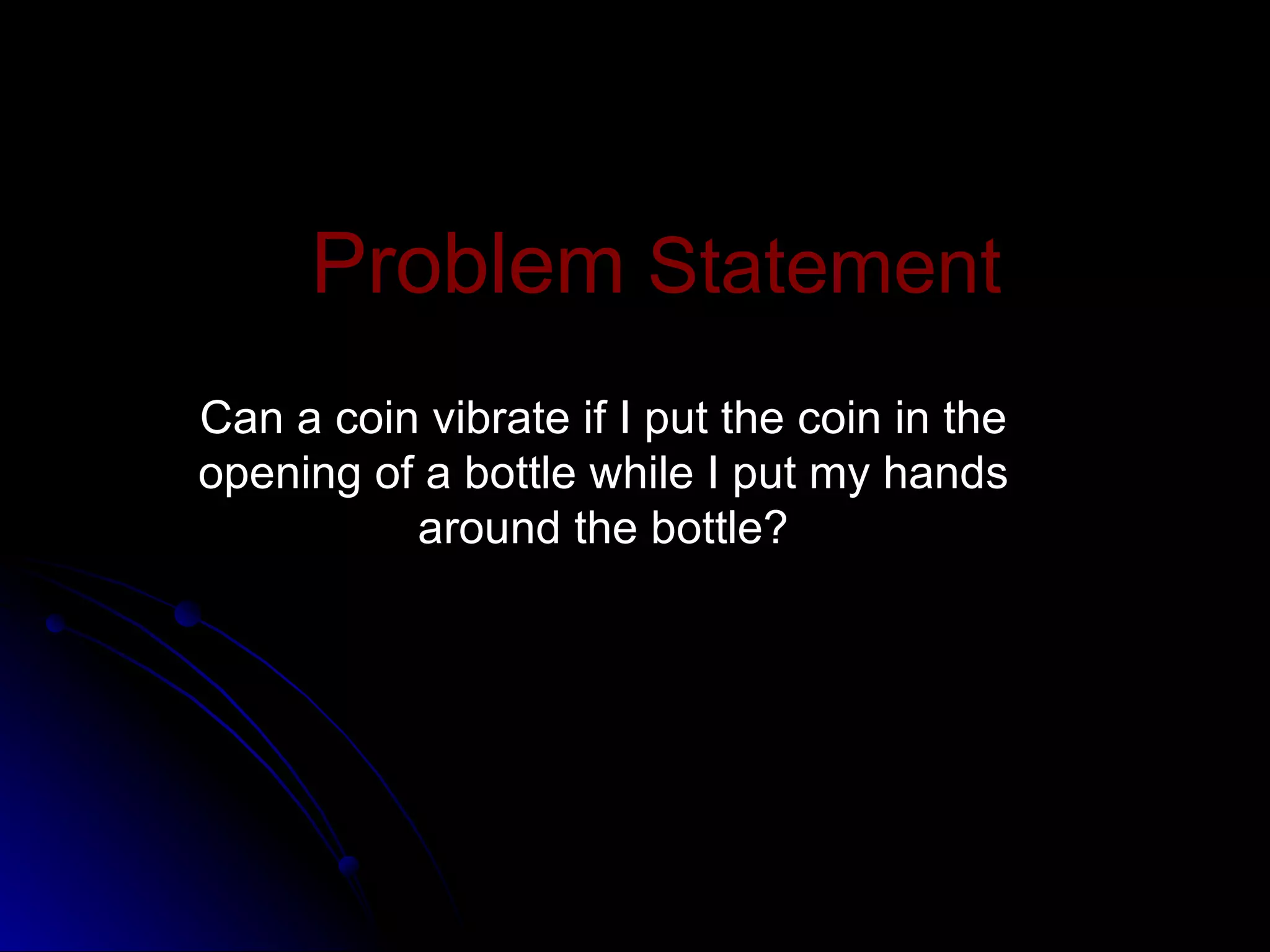 1) The document describes an experiment to test if warming hands around a bottle with a coin on top will cause the coin to vibrate.