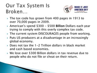 This document summarizes and advocates for the FairTax plan, which would abolish all federal income taxes and replace them with a 23% national sales tax. It argues that the current tax system is overly complex, discourages work and economic growth. The FairTax would be simple, transparent and visible to taxpayers. It would tax consumption and ensure low-income households pay no taxes on basic necessities through a monthly tax rebate. Supporters believe the FairTax would boost the economy, make U.S. products more competitive, and generate the same tax revenue as the current system in a more efficient manner.