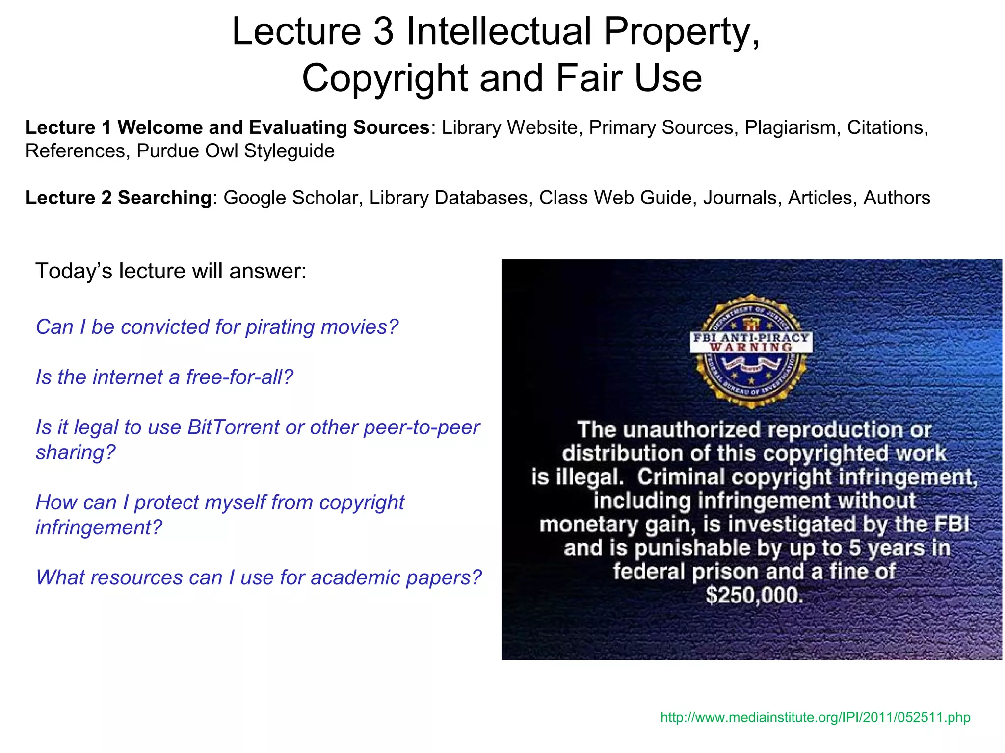 This document provides an overview of intellectual property, copyright, and fair use. It discusses the different types of intellectual property including copyright, patents, and trademarks. Copyright protects literary and artistic works. For a work to be copyright protected it must be original, fixed in a tangible form, and creative. Copyright lasts for the life of the author plus additional years depending on when the work was created. Fair use allows for limited use of copyrighted works for purposes like criticism, commentary, news reporting, teaching, and research. Peer-to-peer file sharing and pirating copyrighted content without permission can result in legal penalties. The document also discusses resources like Creative Commons, Flickr, and Wikimedia that allow for lawful sharing and reuse of