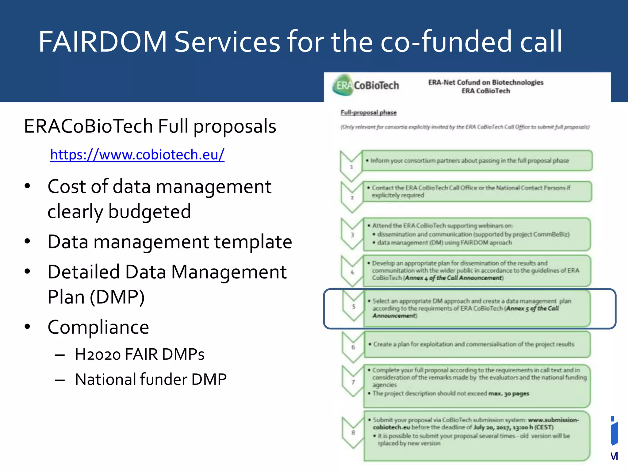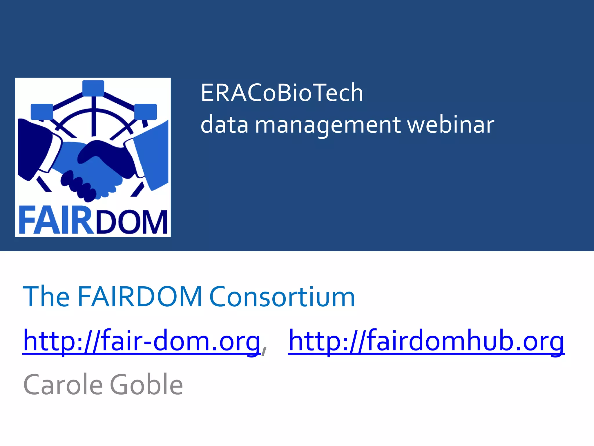 This document provides information about a webinar from the FAIRDOM Consortium on data management for ERACoBioTech full proposals. It includes: