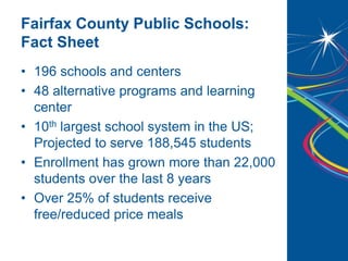 Fairfax County Public Schools (FCPS) provides a comprehensive work-based learning framework aimed at preparing students for college and careers, serving a large and diverse student body. The initiative includes various programs such as internships, job shadows, resume workshops, and industry partnerships, focusing on key competencies and support for all students, including those with disabilities. This approach aligns with FCPS's overall strategic goals of student success and resource stewardship.