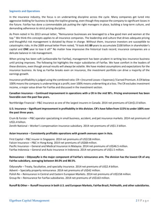 This document provides an investment thesis on Fairfax Financial Holdings Limited (FFH). It summarizes that FFH is a property and casualty insurance holding company led by CEO Prem Watsa. FFH's business model is similar to Berkshire Hathaway, using insurance premium cash flow and disciplined investment management to generate returns. Over 30 years, Prem Watsa has delivered outstanding returns for shareholders through successful insurance operations and investment performance that rivals Warren Buffett. The document evaluates FFH's operations, management team, investment portfolio performance, and provides a valuation for the company.