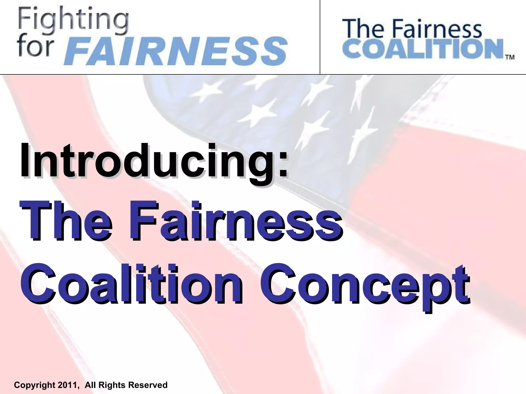This document introduces the Fairness Coalition, a group formed by concerned citizens to discuss a new approach to politics outside of the traditional parties. The Coalition aims to evaluate all political issues based on the principle of fairness rather than political expediency. Fairness is defined as ensuring equal opportunity to be heard, balanced application of power without favoritism, and advocating for solutions for all. The Coalition represents ordinary Americans and seeks to restore faith in the political system by assessing policies based on whether they help more people than they harm.