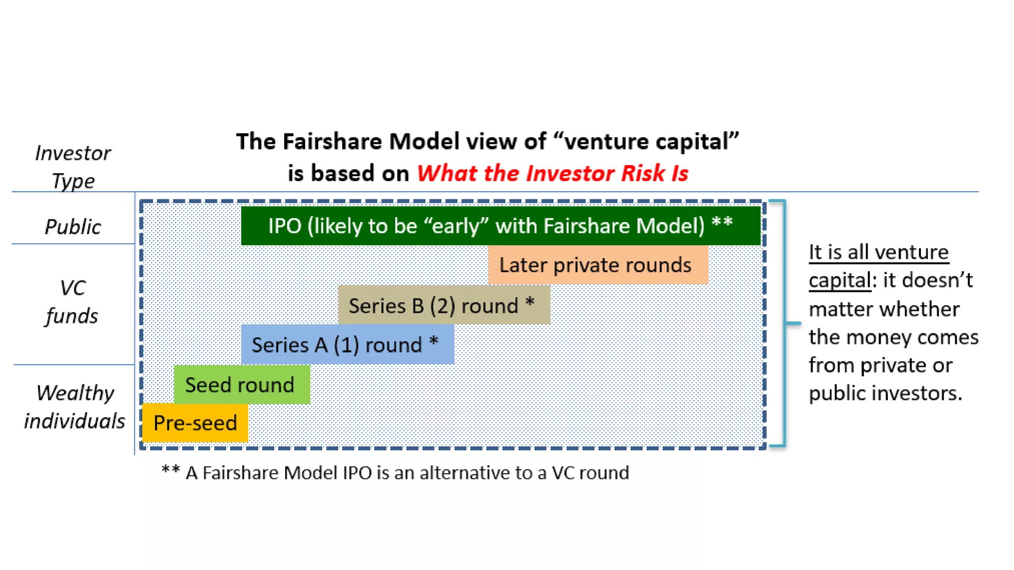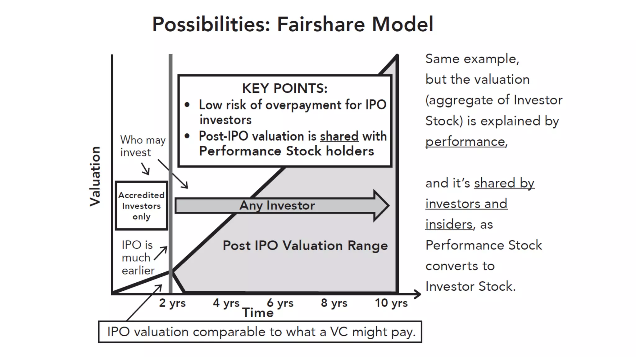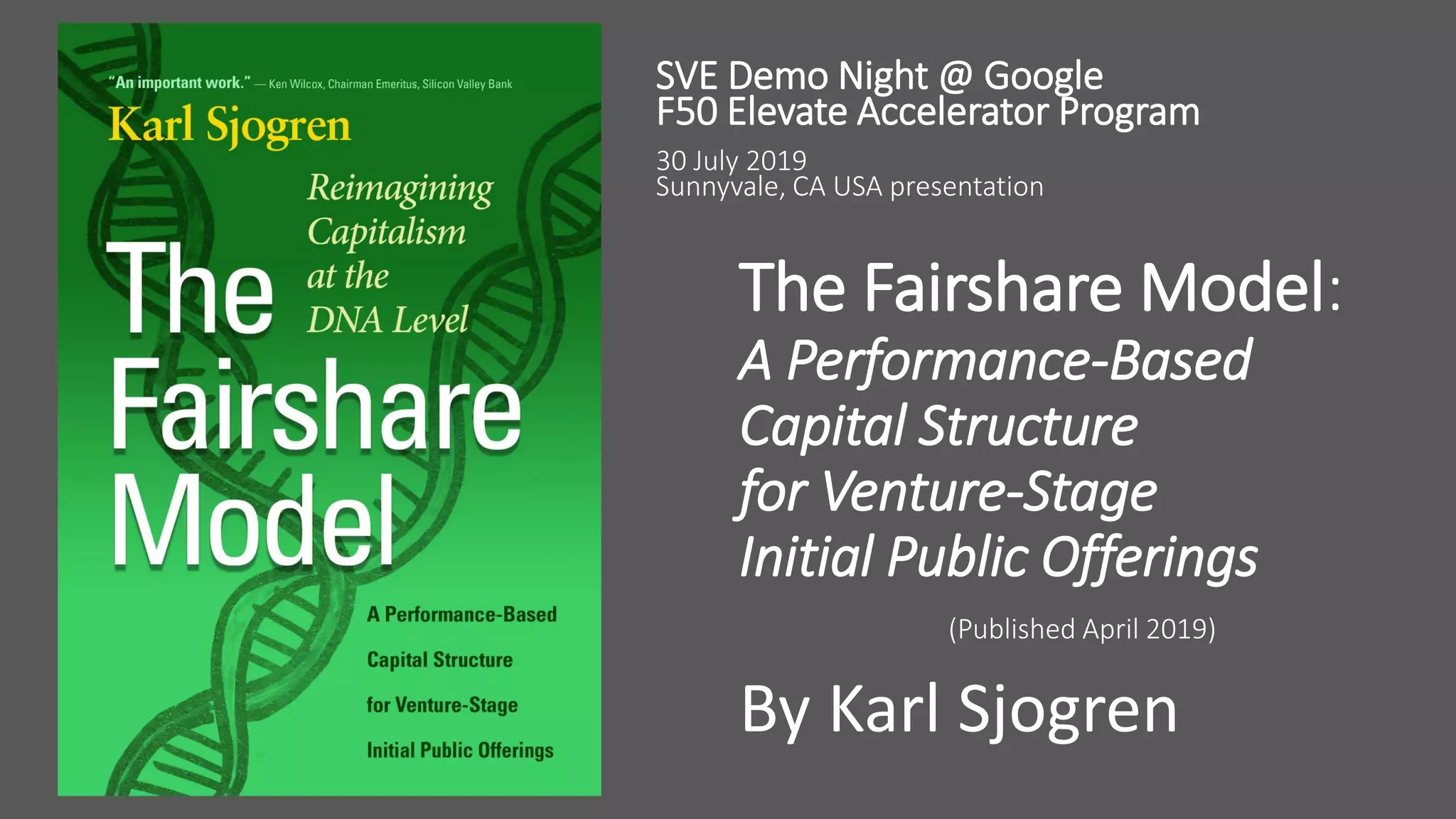 The document summarizes Karl Sjogren's presentation on the Fairshare Model, which proposes an alternative capital structure for venture-stage initial public offerings (IPOs). The Fairshare Model aims to reduce valuation risk for IPO investors by using a multi-class stock structure similar to what venture capitalists use. This would give average investors terms comparable to VCs while incentivizing companies to offer a low pre-money valuation. Sjogren discusses how the model addresses different perspectives on venture capital and compares the valuation risk of conventional, modified conventional, and Fairshare Model structures. He outlines the key components of the Fairshare Model capital structure and its potential benefits for investors, employees, and companies pursuing a venture-stage IPO