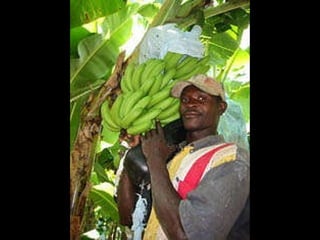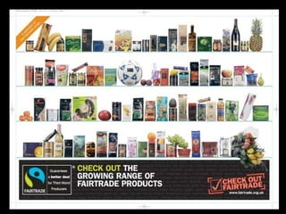 Fairtrade is an organization that aims to address unfairness in global trade by ensuring farmers and workers receive fair wages and safe working conditions. Typically, farmers earn only a small fraction of the price paid for products while the rest is distributed among other entities in the supply chain. Fairtrade guarantees farmers a fair minimum price for their crops, long-term trading partnerships, and support for community development projects. This helps provide a more reliable income and improves lives, as farmers report being able to afford basic necessities and regain their dignity through Fairtrade.