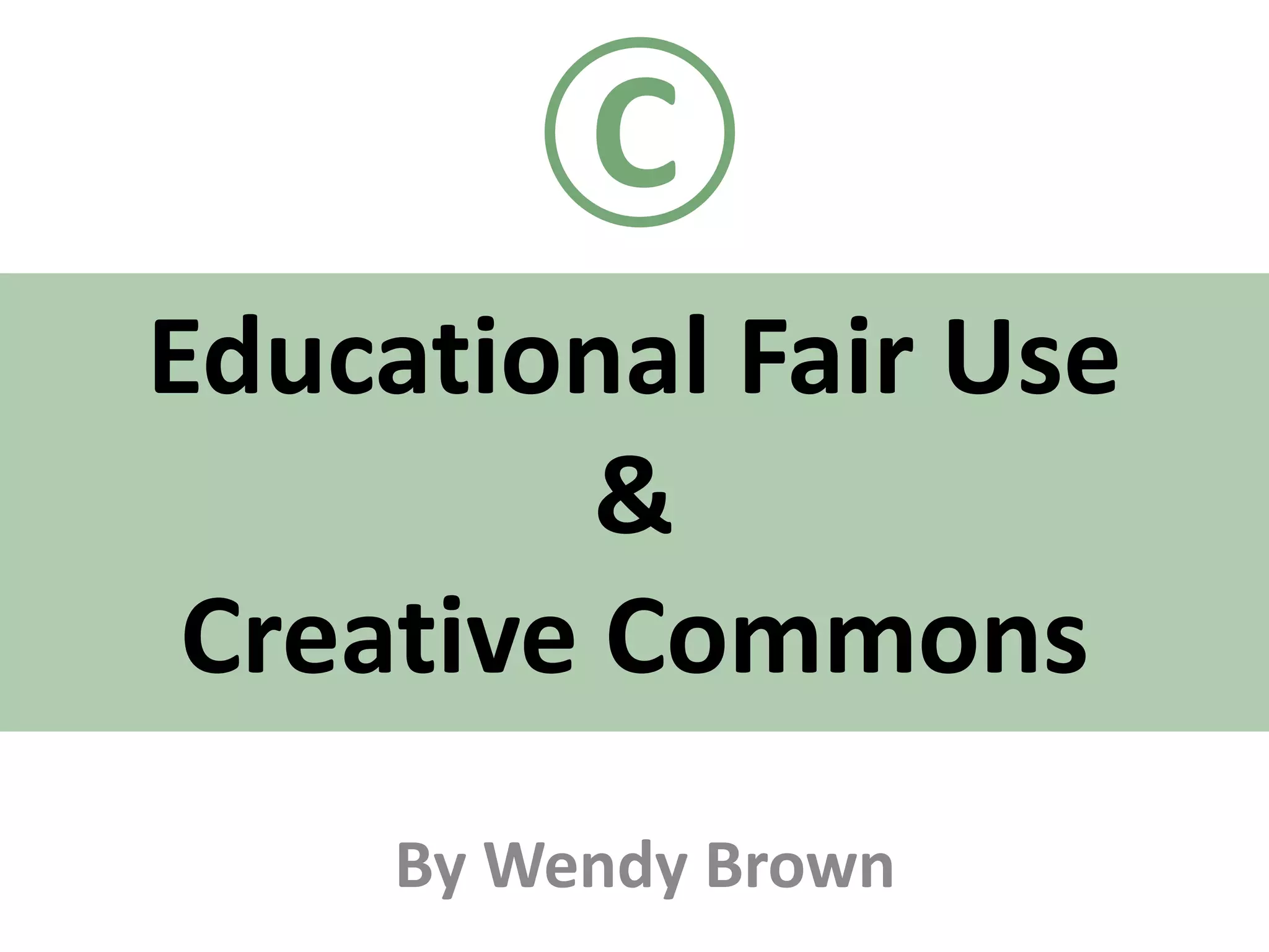 Educational fair use allows the use of copyrighted materials for educational purposes, including in lessons, curriculum materials, and student work. It has five key principles: 1) using copyrighted works in media literacy lessons, 2) incorporating them into curriculum materials, 3) sharing curriculum materials, 4) allowing student use in academic work, and 5) developing audiences for student work. Creative Commons licenses provide legal means to share, remix, and reuse digital content, aiming to realize the full potential of the internet through universal access to research, education, and culture. They allow simple selection of license terms that both protect content and fit creators' needs. Major organizations and websites use Creative Commons licenses.