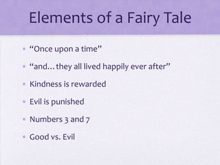 This document discusses common elements found in fairy tales. It notes that fairy tales typically begin with "Once upon a time" and end with "and they all lived happily ever after." They also generally involve goodness being rewarded, evil being punished, and settings like castles or cottages in the woods that include magic. Good characters are usually kind, loyal, and brave, while evil characters are jealous, spiteful, and powerful. The document provides an example of similes used to describe Snow White and explains how to write similes comparing a noun to another using adjectives and "like" or "as."