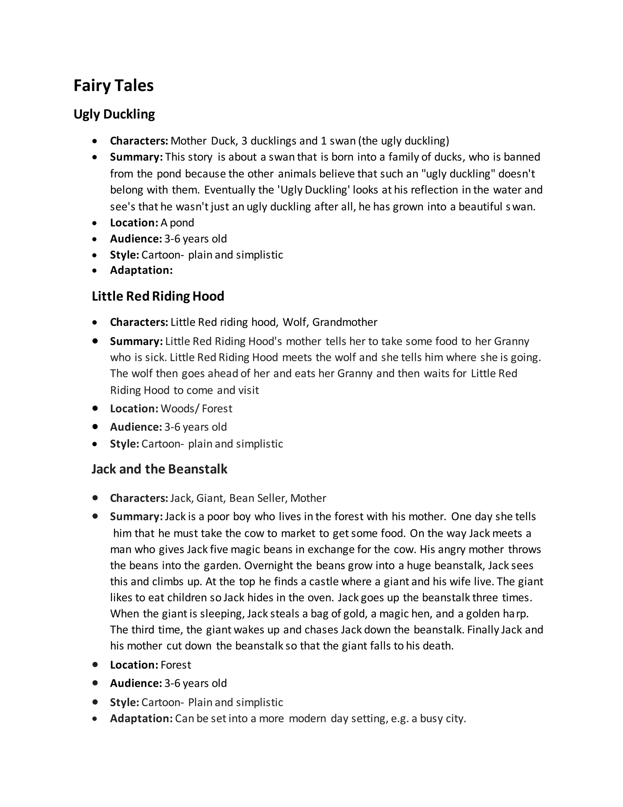 This document summarizes three classic fairy tales: The Ugly Duckling, Little Red Riding Hood, and Jack and the Beanstalk. The Ugly Duckling tells the story of a swan born into a family of ducks who is shunned until he grows into a beautiful swan. Little Red Riding Hood involves a girl who meets a wolf in the woods on her way to visit her sick grandmother, and Jack and the Beanstalk features a poor boy who trades a cow for magic beans, which grow into a beanstalk leading to a land of giants. All three tales are intended for an audience of 3-6 year olds and feature simple cartoon illustrations.