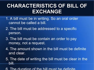 A bill of exchange is a written order from a party (drawer) directing another party (drawee) to pay a specified sum of money to a payee. It must contain an unconditional order to pay a definite amount of money and include a specified time of payment. There are typically three parties to a bill of exchange: the drawer, drawee/acceptor, and payee. A bill of exchange can be used as a written proof of debt and is useful in settling accounts, especially in foreign trade.