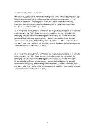 Christian faith introduces unitive norms that are intrinsically rewarding and aim to transcend practical and moral concerns. As an interpretive stance, Christian faith fosters participation in relationship with the Trinity, orienting perspectives and aspirations theologically while empowering, healing, and saving through love. Love transforms ultimate concerns by fostering solidarity with all reality through Christian norms of love.