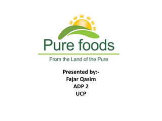 The document discusses financial information for Pure Foods Company, a leading fruit juice manufacturer in Pakistan, from 2013-2017. It provides details on the company's quarterly net profits, sales growth, and profit growth for each year over this period, with net profits increasing between 4.9-10% annually and sales and profit growth generally in the 6-9% range. The company aims to diversify into other food sectors like dairy and cereals while maintaining its purpose of enhancing quality of life through healthier products.