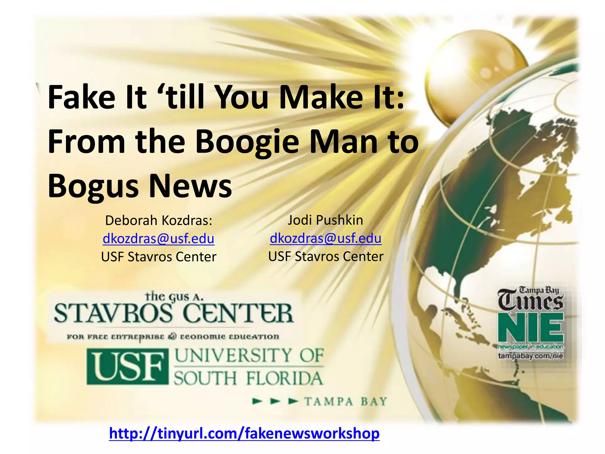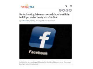 This document discusses the issue of fake news and strategies for identifying unreliable or false information. It provides examples of how fake news can spread online, such as the false "Pizzagate" conspiracy theory. The document also outlines techniques for evaluating the credibility of news sources, like considering the type of content, sources cited, evidence provided, and completeness of information. Identifying different types of unreliable news and the potential economic costs of fake news are also examined. Teaching critical questioning skills is presented as an important way to help recognize fake news.