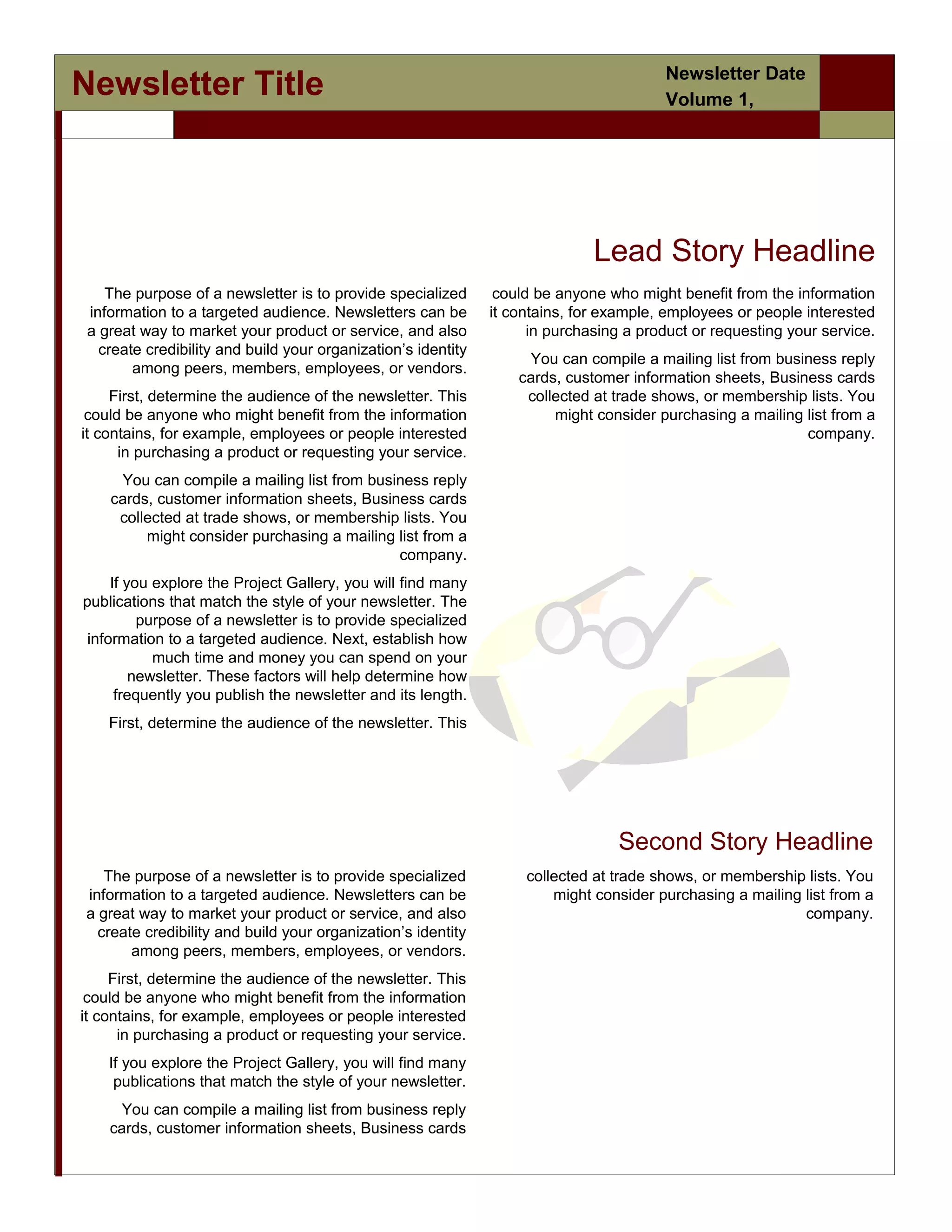 The document discusses key aspects of creating an effective newsletter. It recommends first determining the target audience, which could be employees, customers, or others who may benefit from the newsletter's content. It also suggests compiling a mailing list from various sources like business cards or purchasing an existing list. Finally, it addresses deciding how frequently to publish based on available time and budgets, with quarterly publication considered a good standard.