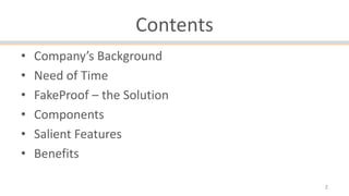 Fakeproof is an anti-counterfeiting and supply chain event management system aimed at combating the threats of counterfeiting in various industries, including pharmaceuticals and luxury items. It offers unique serialization, track and trace capabilities, and smart analytics to enhance supply chain visibility and protect brand integrity. The solution benefits organizations by minimizing revenue losses and reinforcing consumer trust through easy verification processes.