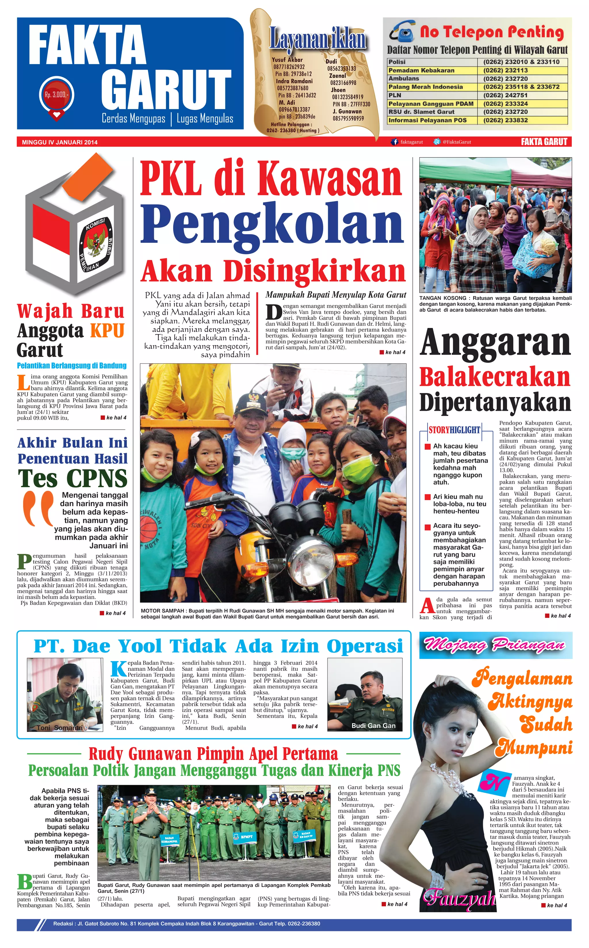 Dokumen ini membahas berbagai isu di Garut, termasuk penertiban PKL dan pelantikan anggota KPU baru. Bupati dan Wakil Bupati Garut melakukan upaya pembersihan kota di hari pertama mereka bertugas, sementara kasus izin operasi pabrik pakan ternak menjadi perhatian. Acara balakecrakan untuk menyambut kepemimpinan baru berlangsung kacau ketika makanan habis dalam waktu singkat, meninggalkan banyak warga kecewa.