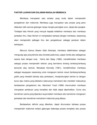 Dokumen ini membahas masalah membaca yang diakibatkan oleh faktor dalaman dan luaran, serta interaksinya. Faktor dalaman mencakup aspek kognitif dan psikologi pembaca, sedangkan faktor luaran meliputi kondisi fisik dan lingkungan. Dengan memahami faktor-faktor tersebut, solusi dapat dirumus untuk memperbaiki kemampuan membaca individu.