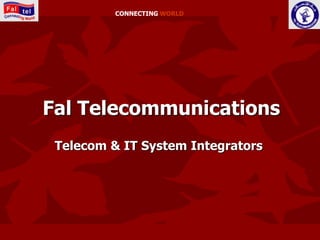 Fal Telecommunications is a leading Qatari telecommunications and IT systems integrator that provides flexible and innovative solutions for enterprises, public administration, and citizens. It offers a wide range of services including GSM and fiber optic network installation, IT services, mobile solutions, and structured cabling systems. The company works with reputable associates and has a broad client base including major Qatari organizations.