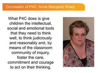 Falconbrook Primary School uses Philosophy for Children (P4C) to develop students' thinking skills. P4C provides intellectual, social and emotional tools to think well, think judiciously, and foster care and commitment to act on thinking. It uses classroom discussions to explore questions and ideas. The goal is not to find answers but to question all answers. P4C sessions begin with a stimulus to provoke philosophical discussion using questioning techniques. This helps students analyze, evaluate, interpret and discuss concepts.