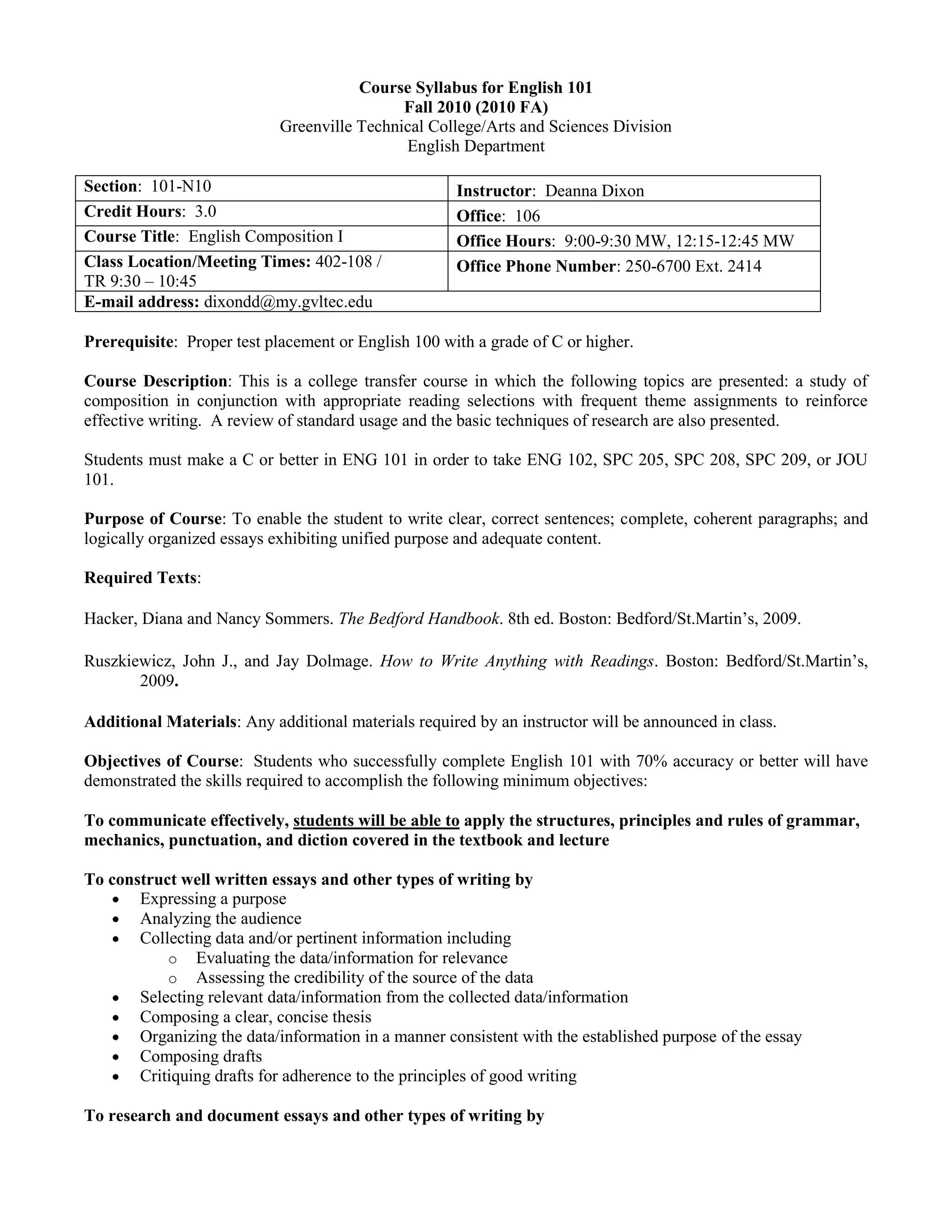 This document provides a detailed course syllabus for English 101 being taught in the fall of 2010 at Greenville Technical College. It outlines the course objectives, assignments, grading policies, schedule of topics and due dates. The major assignments include blog posts, a narrative essay, a rhetorical analysis essay, an annotated bibliography, and an argumentative research project with a visual component. Students will learn skills in writing, research, rhetoric, and documentation and be assessed through these assignments as well as quizzes, peer reviews and a final exam.