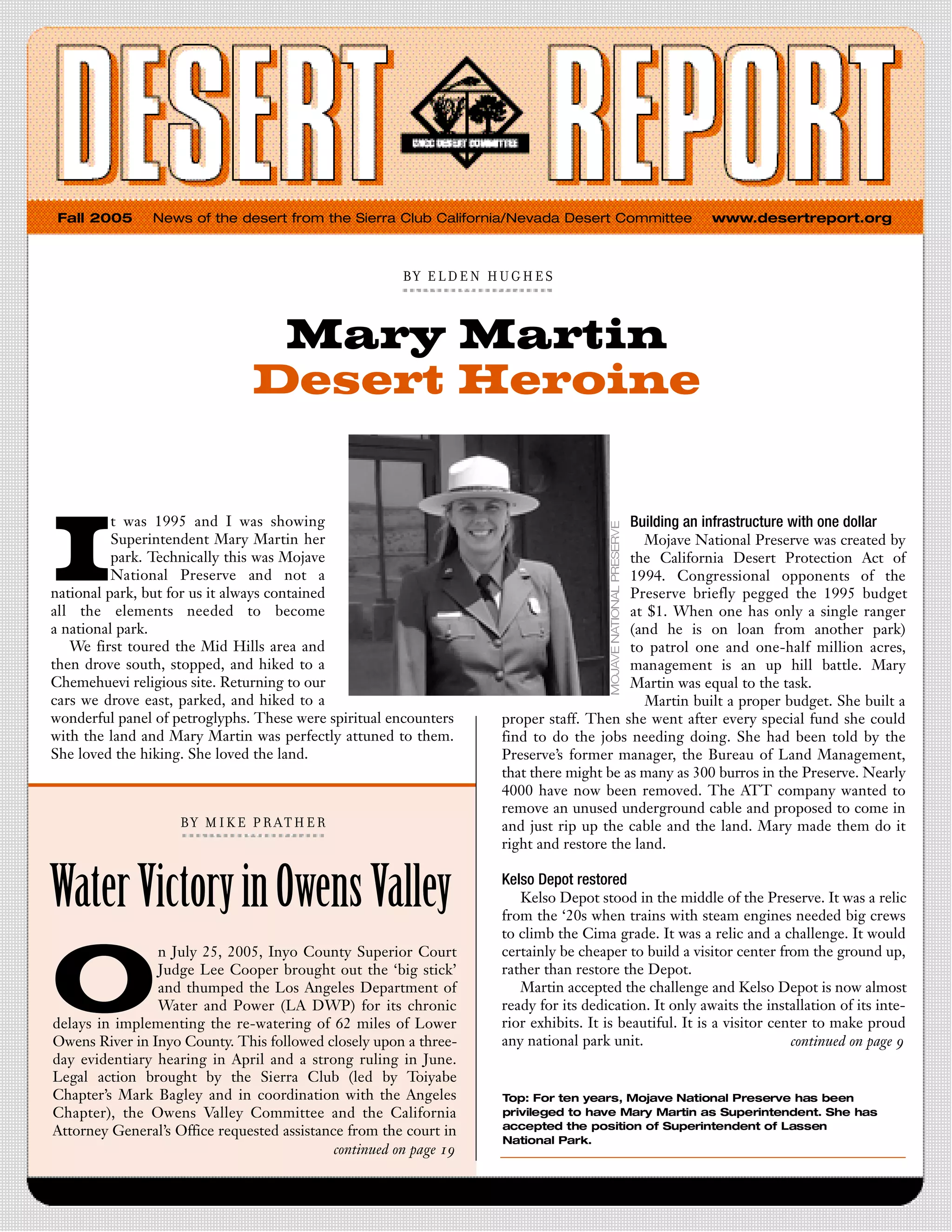 This document summarizes Mary Martin's reflections on her first 10 years as Superintendent of Mojave National Preserve. It discusses some of the challenges she faced such as operating the preserve on a budget of only $1 initially. It describes how she built up the infrastructure and staff, removed nearly 4000 burros, and oversaw the restoration of the historic Kelso Depot building into a visitor center. The document honors Martin's leadership and accomplishments in establishing the preserve during its early years.