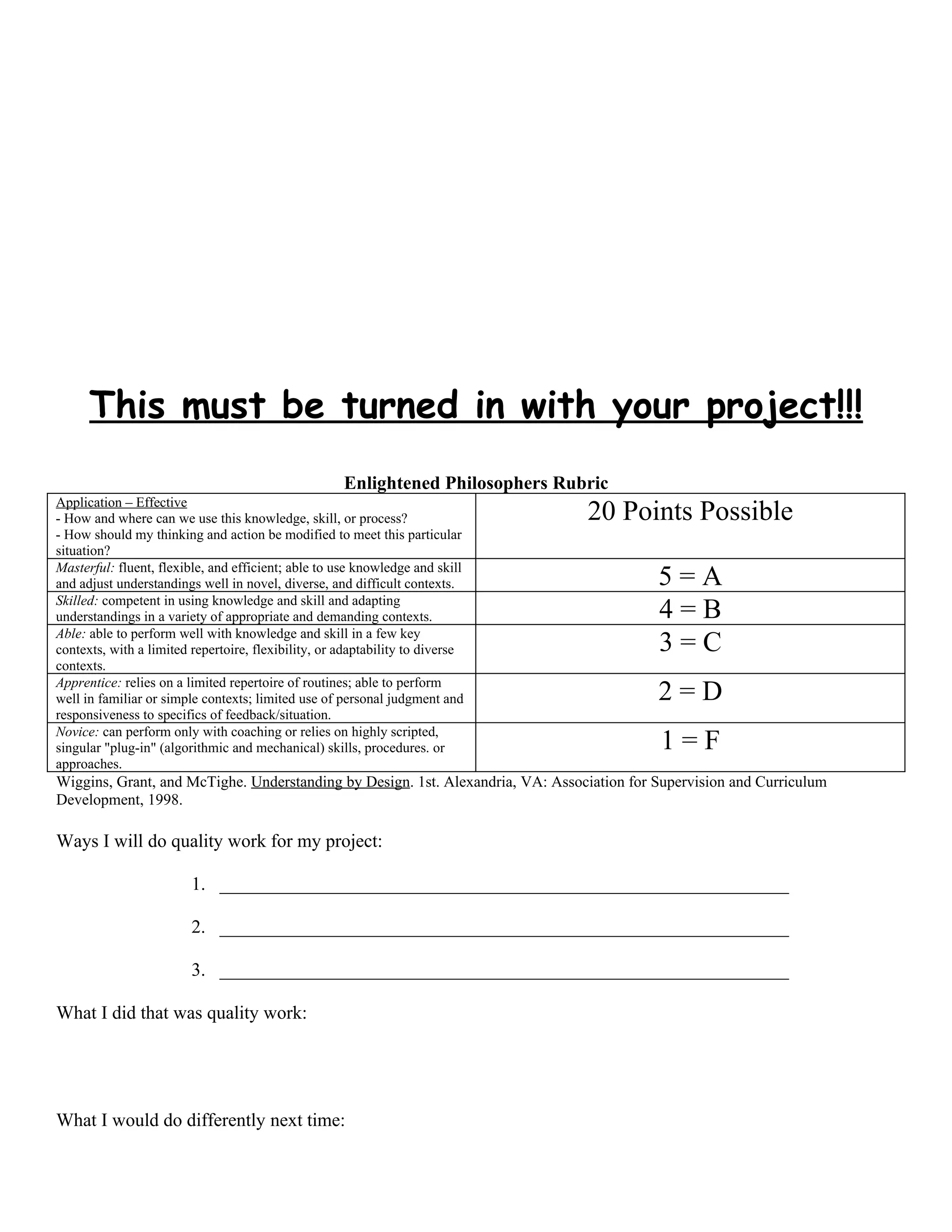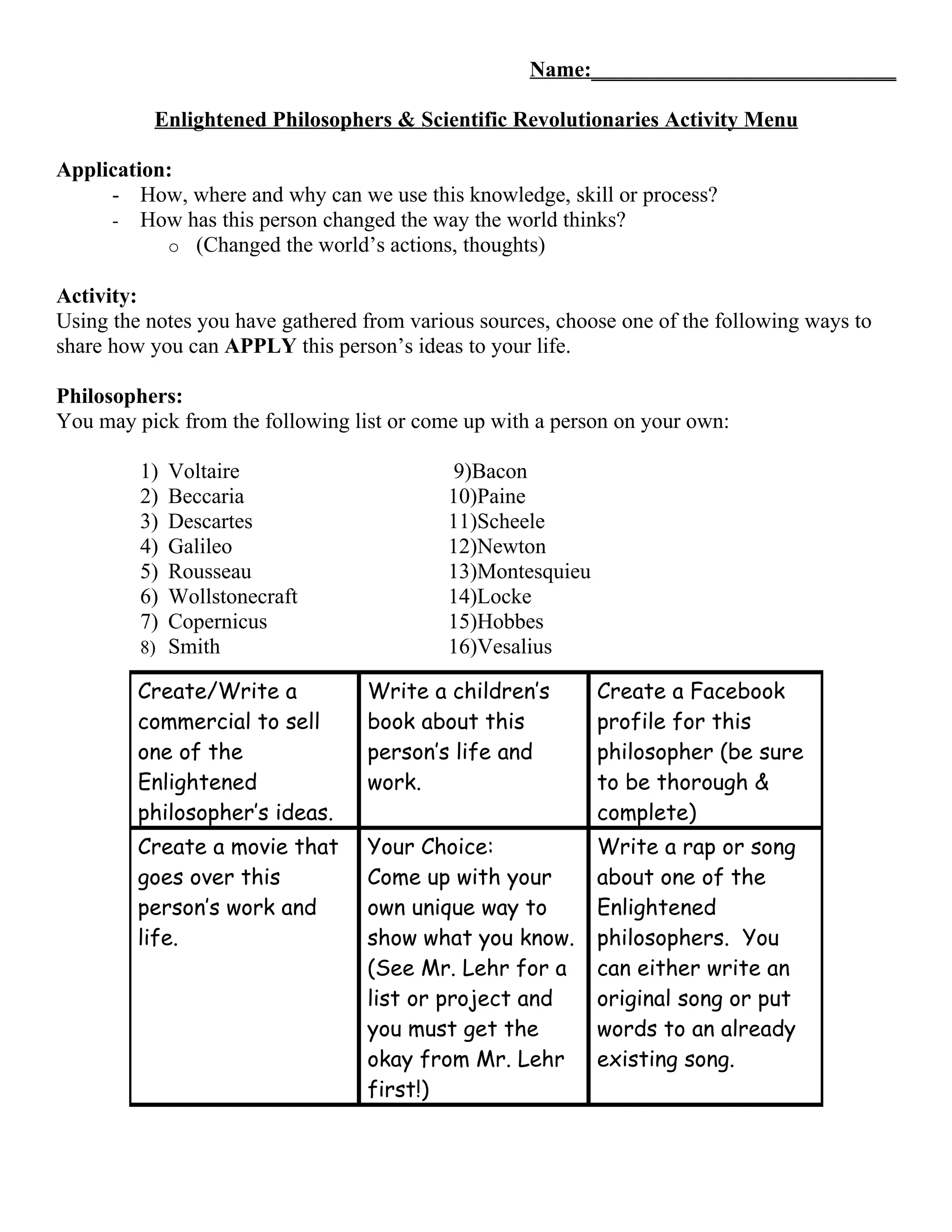 This document provides guidance for a student activity on applying the ideas of Enlightenment philosophers and scientific revolutionaries. Students can choose one philosopher from a list and complete an activity such as writing a commercial, children's book, or Facebook profile to demonstrate how the philosopher's ideas can be applied to modern life. The rubric evaluates students on their ability to explain how the knowledge can be used and how their thinking should change based on different situations. Students are also asked to outline what they will do to ensure quality work and reflect on what they did well and could improve.
